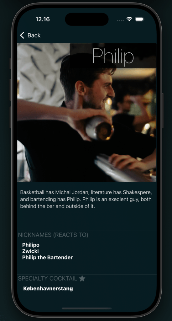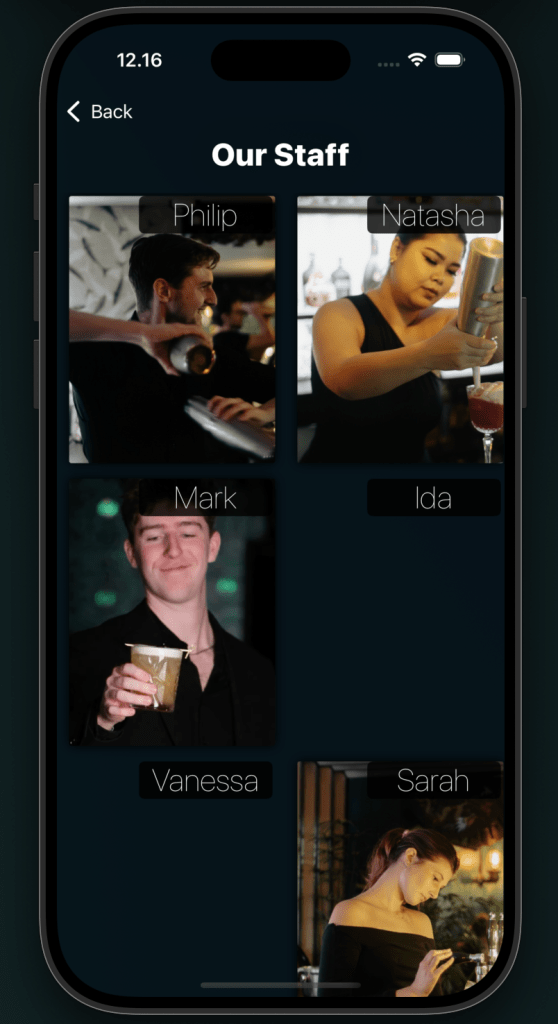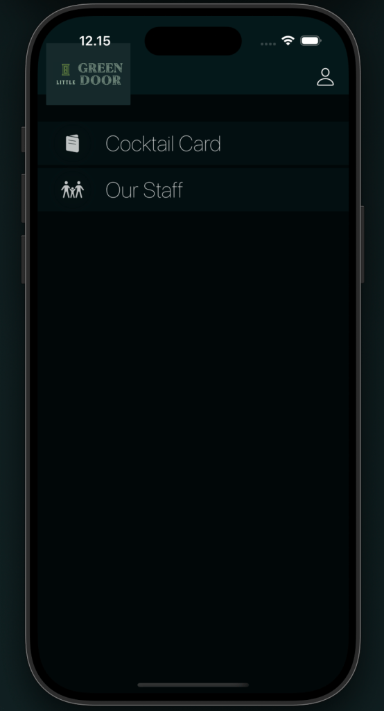 The little green door app gives an insight into the classic and seasonal cocktails available at the danish Cocktail bar Little Green Door. The app will give the user a window into the unique and enticing atmosphere that is the trademark the charming bar located at Gammel Strand. A staff page shows all the current staff of Little Green Door, with their pictures being links to a detail-page about them.