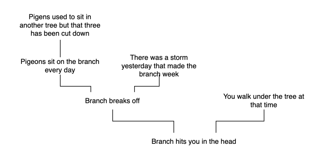 But the situation can be analysed in the same way. Maybe their parents never thought them how to throw, and they were always just talking in the breaks in school and never learned how to throw properly. Then you might say, okay its fair enough that they don’t know how to throw a stick, but if they don’t know how to throw then they should’t throw sticks in parks where there are other people. True, but maybe they are walking their friends dog for the first time. And they have always seen people throw sticks so easily. Maybe its their first time trowing a stick and they thought that it was much easier than it is. They didn’t know how difficult it was. It can’t be their fault that they didn’t know that. Is it then their parents fault that you got hit because they didn’t teach their kid how to throw a stick? But there is reasons for that too. Or maybe the person was distracted and didn’t see you because their dad just died this morning and they are overwhelmed with grief and couldn’t think or see clearly.